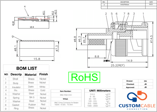 SKU: BNC-RG6-CCCBNC Crimp Connector for Belden 1694A - 6 GHz - 75 Ohm